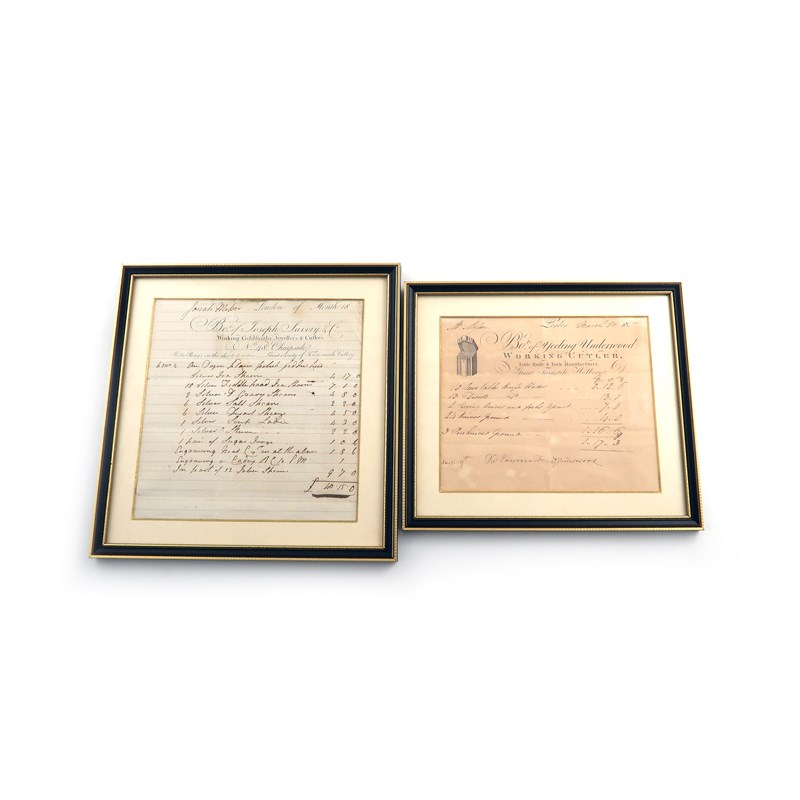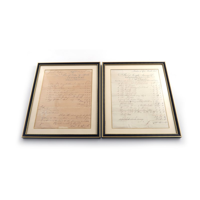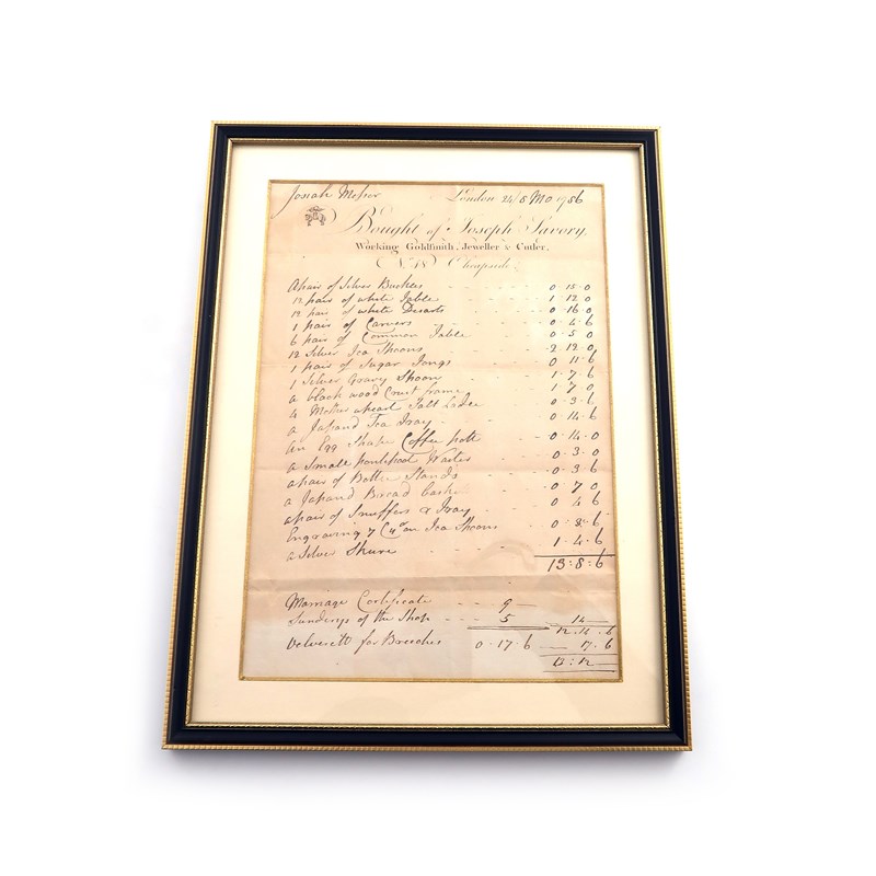 including: three from Joseph Savory and Co., of 48 Cheapside, for various items including a pair of snuffer's trays and Fiddle Head flatware, one dated 24 August 1786, one dated 12 March 1812, Yeeling Underwood, Working Cutler, March 8th 1821, one from Edmund Sporle, Cutler, January 1810, and six smaller receipts in one frame.(6)