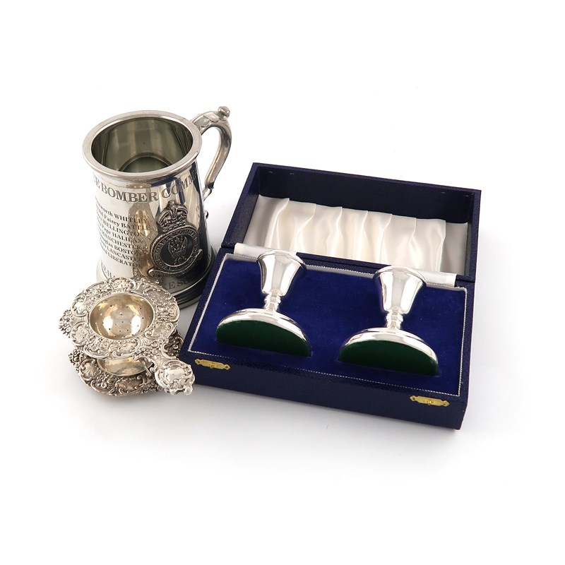 comprising silver items: a cased pair of modern dwarf candlesticks, Birmingham 1983, cased, a German tea strainer and stand, with foliate and scroll decoration, and a modern pewter commemorative tankard celebrating the Royal Air Force Bomber Command, approx. weighable 4oz. (4)