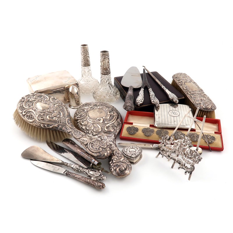 comprising: a cased set of six Edwardian Art Nouveau buttons, by Walker and Hall, Chester 1906, shaped form with a female head and foliate decoration, a menu card holder, Birmingham 1900, cherub and foliate scroll decoration, easel back, a heart shaped box, a fruit knife, a novelty inkwell modelled as an artillery shell, a cigarette box, a cigarette case, a cased set of six teaspoons, a pair of silver-mounted glass scent bottles, lacking stoppers, a hand mirror, two brushes, a button hook, a shoe horn, a pair of glove stretchers, and a silver-handled slice, and two knives, approx. weighable 5oz. (qty)