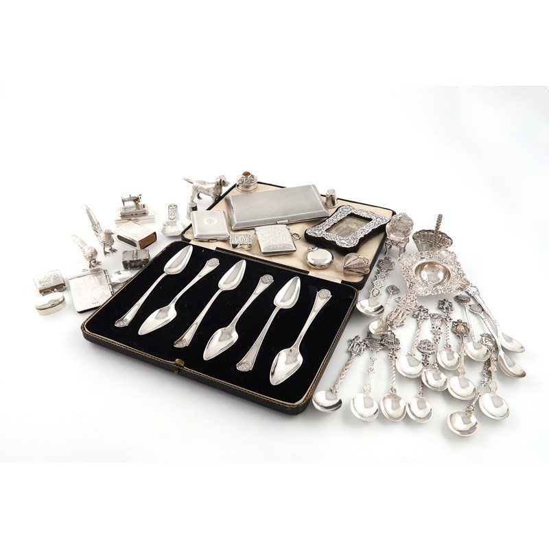 comprising silver items: a note pad, with import marks for 1904, a sovereign case, a cigarette case, two matchbox covers, a vesta case, a pair of miniature pheasants, a box with a small sewing machine on the cover, a Scottish caddy spoon, two thimbles, a small frame, a miniature chair, a cased set of six grapefruit spoons, plus various metalware and electroplated spoons, an electroplated dog, basket and trunk and a tea strainer, approx. weighable 22oz. (qty)