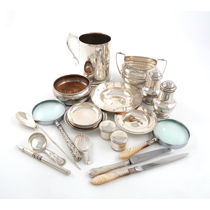 comprising silver items: two pepper pots, London 1931 and 1932, two circular boxes, two Armada dishes, a small coaster, a two-handled sugar bowl, a caddy spoon, London 1802, another caddy spoon, a copy of a Roman spoon, and six metalware dishes, plus an electroplated mug, two magnifying glasses, (one handle a.f), and three other items, approx. weighable 22oz. (qty)