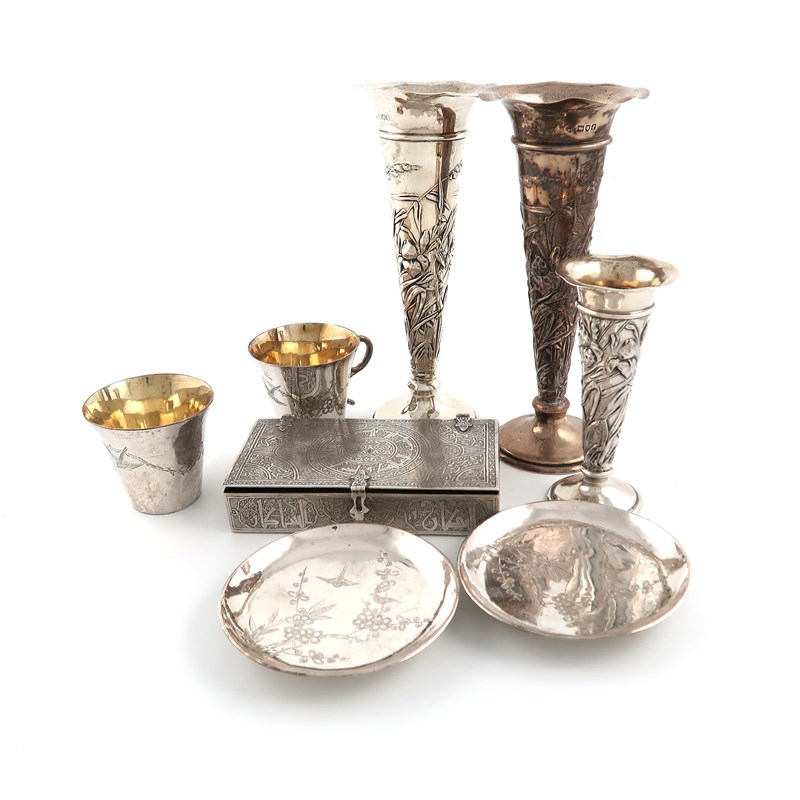 compromising: an Egyptian silver trinket box, Al-Mansura 1932, a pair of Chinese silver cups and saucers, with gilded interiors, three trumpet vases by William Comyns & Sons, London varying dates, with embossed foliate decoration, approx. weighable 20.6oz. (8)