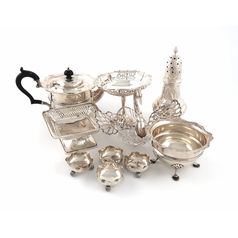 comprising: a teapot and sugar bowl, Chester 1922, a pierced tazza, a sugar caster, a square bonbon dish, a set of four salt cellars, and a silver-mounted swan glass dish, the mount loose, approx. weighable 37oz. (qty)