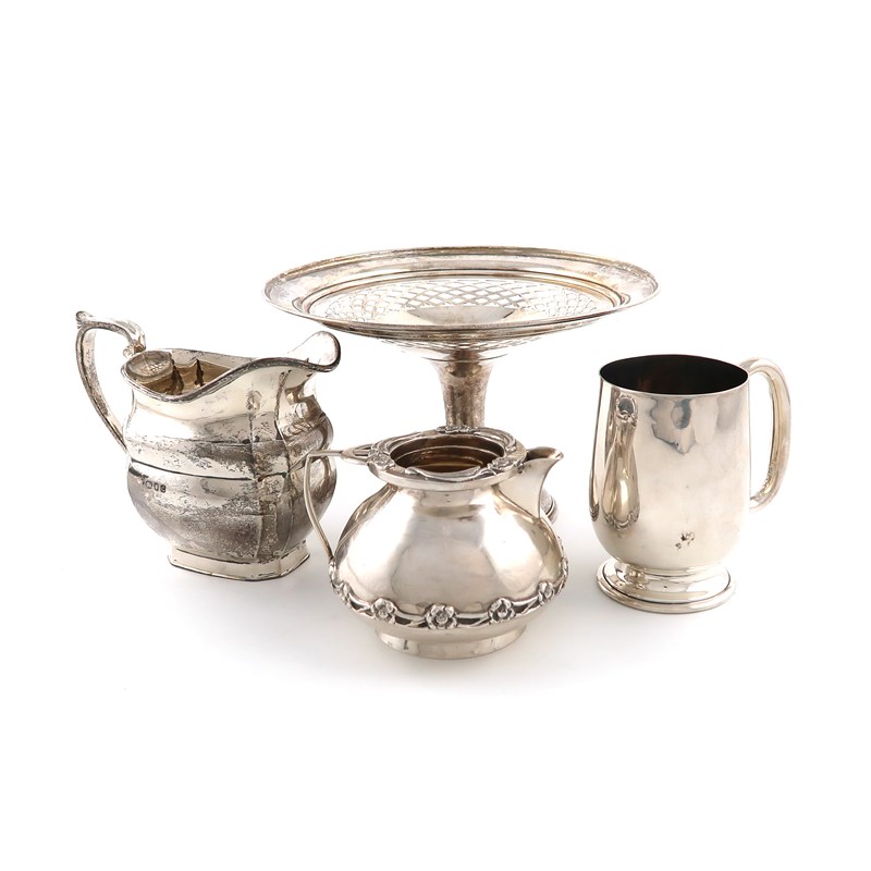 comprising: an Edwardian christening mug by Joseph Gloster, Birmingham 1901, of circular form, scroll handle, on a reeded circular foot, an Edwardian tazza by Marks & Cohen, Birmingham 1907, circular form, a cream jug, maker's marks worn, London 1938, oblong shaped form, canted corners, scroll form handle on an oblong shaped foot, and an Edwardian cream jug by Jones & Crompton, Birmingham 1902, circular bellied form, with foliate motif decorative band, a foliate decorated rim, scroll handle, on a circular foot, total approx. weight 19.6oz. (4)