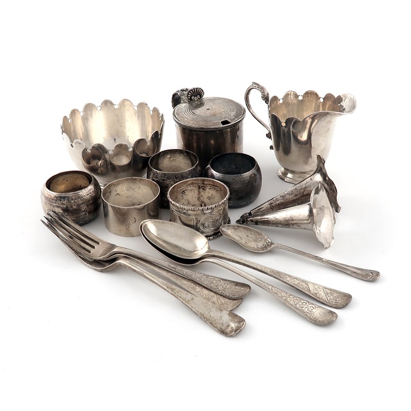 comprising: an Irish cream jug and sugar bowl, by Finnigan's Ltd. Dublin 1917, a George IV mustard pot, leaf capped scroll handle, five various napkin rings, two christening forks and spoons, plus a fork and a teaspoon and two unmarked vases from an epergne, approx. weighable 21oz. (qty)