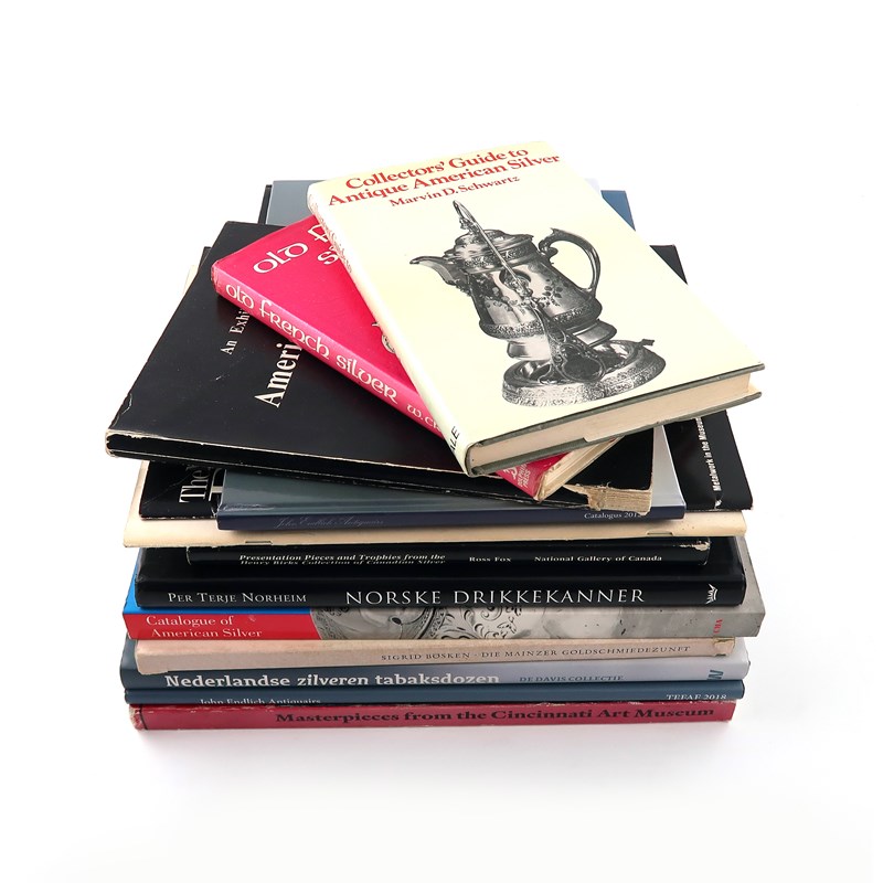including: Norske Drikkekanner 1580-1830, by L. Tradisjoner, Nederlandse Zilveren tabaksdozen 1650-1800, two John Endlich catalogues, Old French silver, The Cleveland Museum of Art, Catalogue of American Silver and other volumes. (qty)
