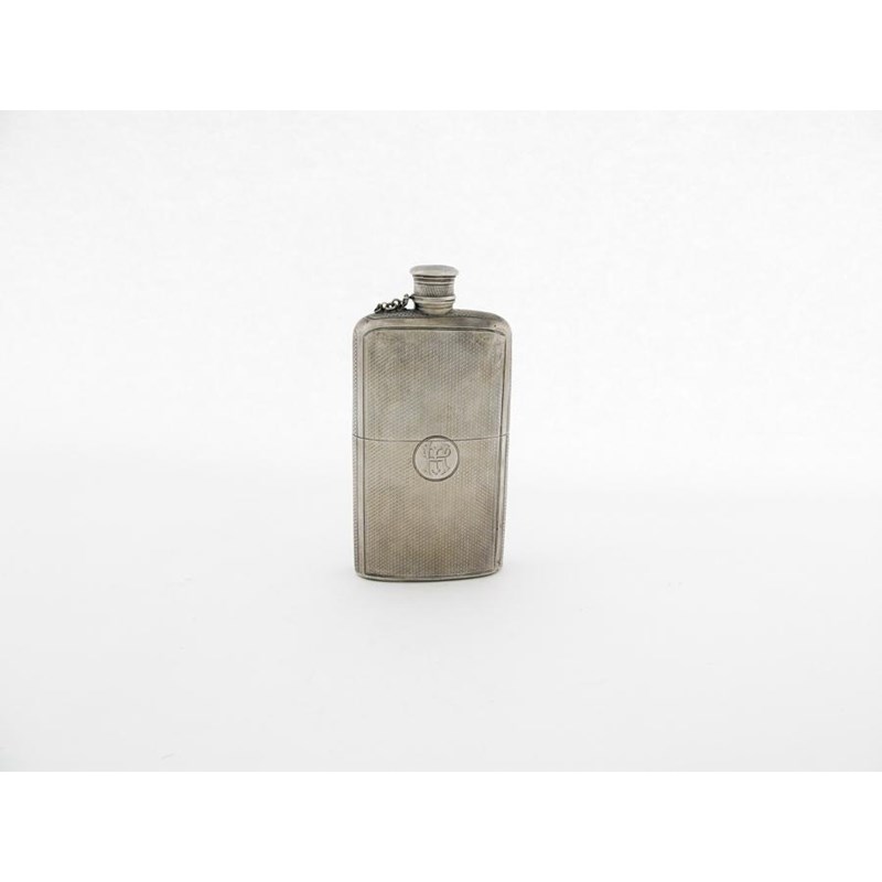 A Victorian, engine-turned spirit flask, with a screw cover, secured by a chain and a pull-off base, monogrammed, by Thos. Johnson, London 1863, retailed by "Thornhill, 144 Bond St", 6in (15.3cm) high, 10oz.
