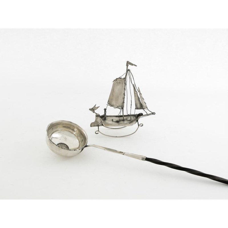 A George III punch ladle, with a coin-inset bowl and a twisted whalebone handle, together with a 19th century Dutch miniature model of a sailing vessel or dhow, the later 5in (12.75cm) high. (2)