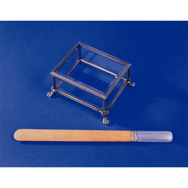 Faberge: a late 19th century early 20th century, two colour gold and enamel mounted, satinwood paper knife, the hilt with translucent mauve and a light blue enamel on a guilloche ground with two applied rose coloured moulded wires and a band of green leaves Kokoshnik & Workmasters mark only, for Karl Gustav Hjalmar Armfeld, c.1900.