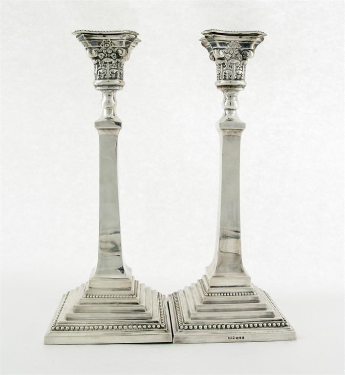 A pair of modern candlesticks, with stylised corinthian terminals, on stepped bases with beaded decoration, maker mark A T & Sn, London 1960, 11.25in (30.8cm) high.