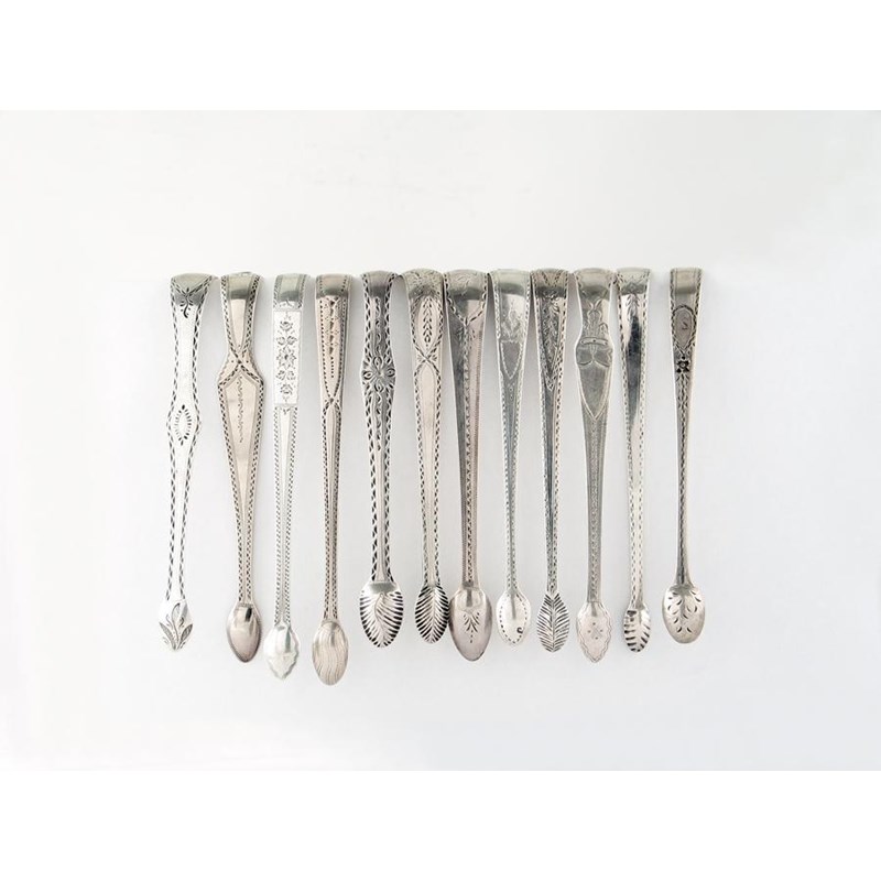 Twelve various pairs of George III bright-engraved sugar tongs, mixed makers and dates. (12)