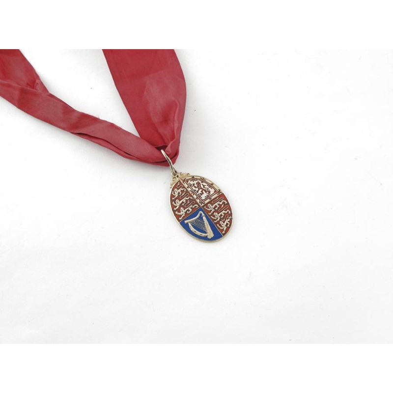 A 20th century gilt-copper and enamelled Herald's badge, on a red ribbon.