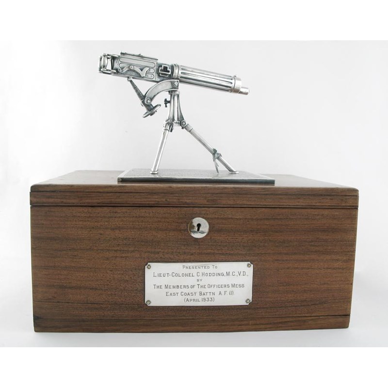 Regimental Interest: an Indian cedarwood cigar box, with a replica model of a Vickers machine gun attached to the cover and a plaque on the front, inscribed "Presented to Lieut-Colonel C. Hodding, M.C., V.D, * by the members of the Officers Mess East Coast Battn A.F. (I) April 1933" (sold with three photographs of the recipient), the box 11.5in (29.2cm) long.