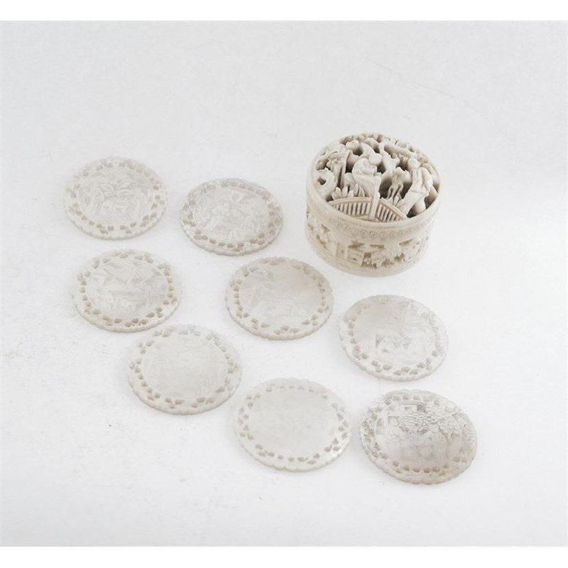 A 19th century Chinese carved ivory counter box, with a screw cover and eight carved mother of pearl counters with engraved decoration, 1.5in (3.8cm) diameter.