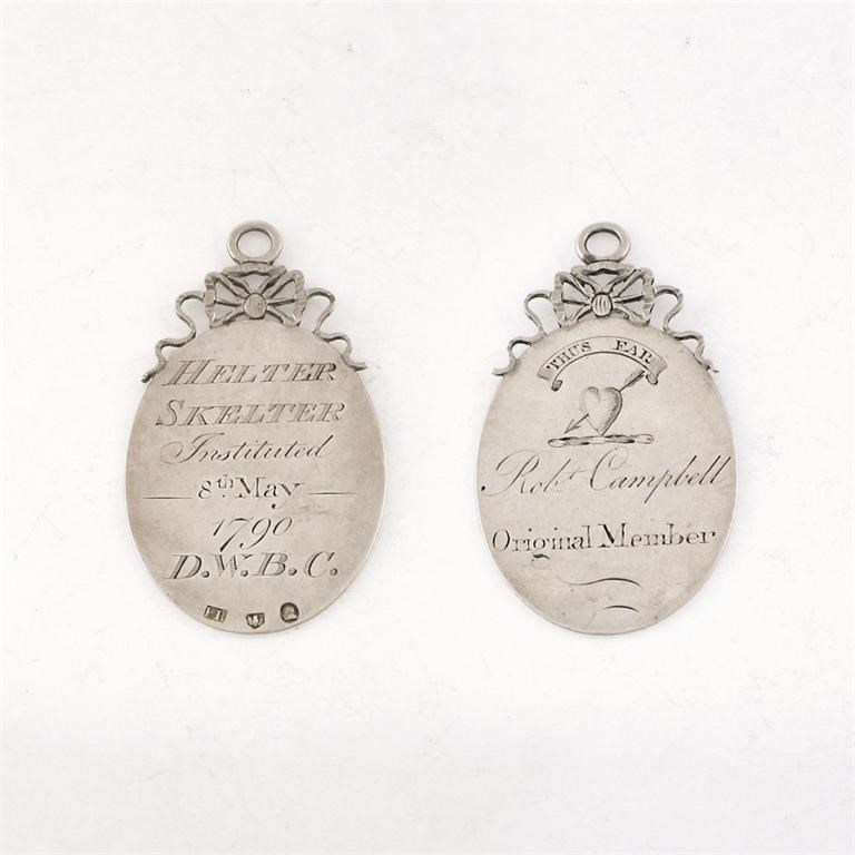 A rare George III Scottish "HELTER SKELTER" club badge inscribed "HELTER SKELTER, Instituted 8th May 1790 D.W.B.C" on one side and inscribed "Robt Campbell Original member" below a crest and the motto "THUS FAR" on the other with openwork ribbon surmount, by Patrick Robertson, Edinburgh c.1790 (no date letter), 2.6in (6.6cm) high.
