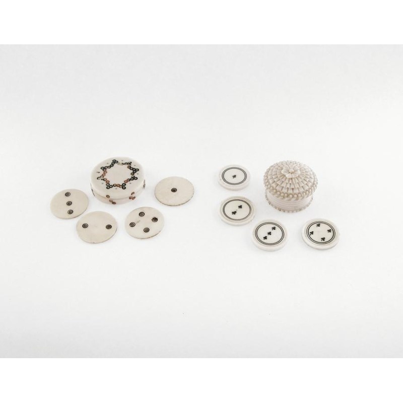 Two small ivory counter boxes and covers: one with a carved cover containing four counters representing 1, 2, 3 & 4 of clubs, the other probably Indian with painted and pique decoration containing four counters marked 1-4 with concentric circular motifs. (2)