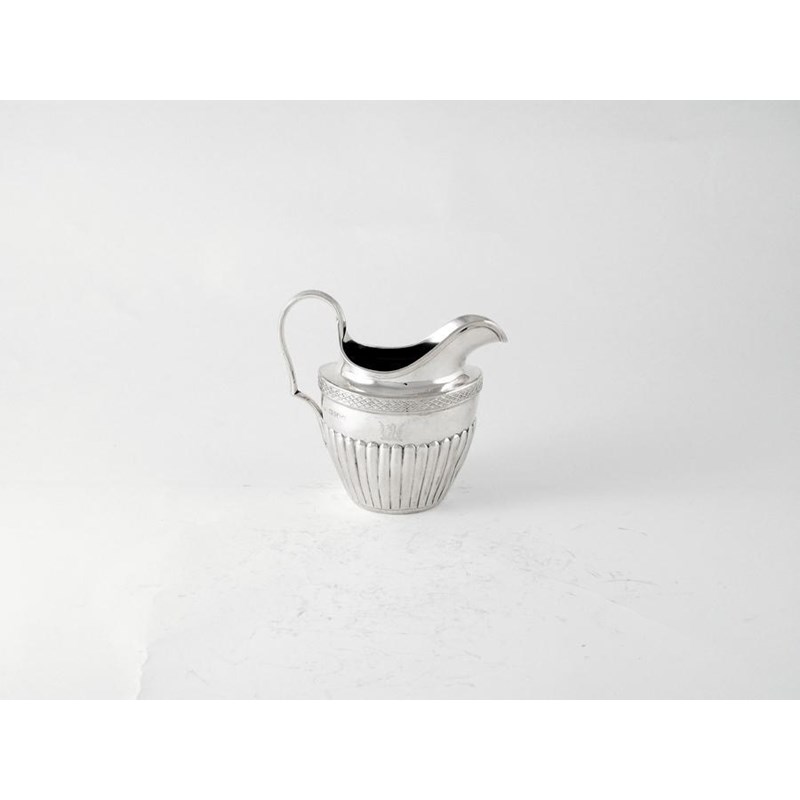 A Victorian part-fluted cream jug, with a helmet shaped lip, scroll handle and a frieze of latticework, maker's mark worn, (retailed by Watherston, London), London 1888, 4.6in (11.7cm) high, 6oz.