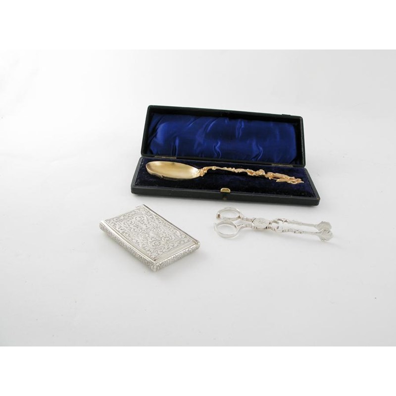 A mixed lot: A 19th century French oblong snuff box with chased and eisele decoration, gilt interior, a decorative silvergilt spoon with figures on the terminal and English Import marks for London 1898 (cased) and a pair of George III sugar nips, 6.25oz. (3)
