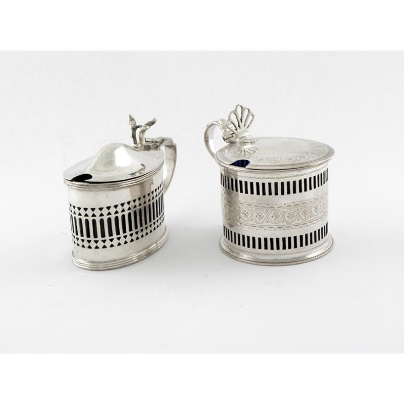 A modern pierced drum mustard, with engraving and a blue glass liner, London 1917 and a pierced oval mustard blue glass liner, Chester 1920, 5.5oz weighable silver. (2)