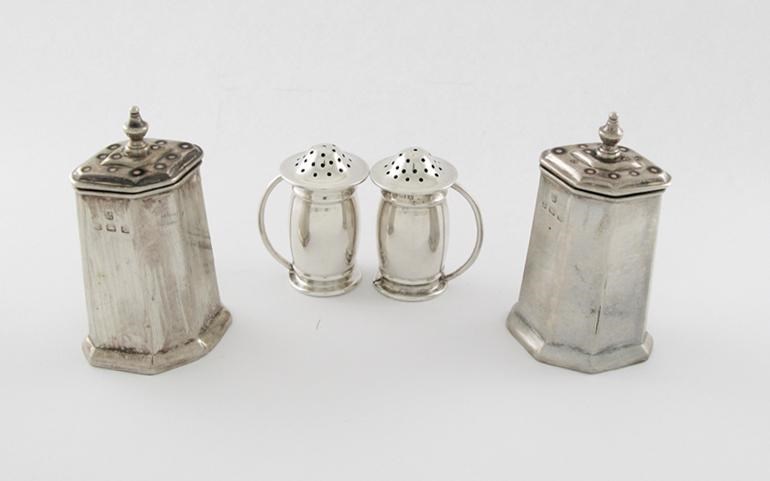 A pair of miniature peppers, with domed covers by Levi & Salaman, Birmingham 1910 and another pair of peppers with panelled bodies, the former 1.75in (4.2cm) high, 2.75oz. (4)