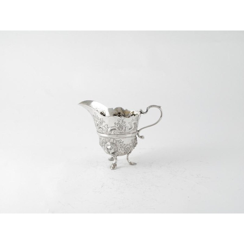 A George II embossed helmet cream jug, on three mask supports with hoof feet and a moulded girdle, no apparent maker's mark, lion passant and leopard's head only, London c.1740, 4.25in (10.8cm) high, 5oz.