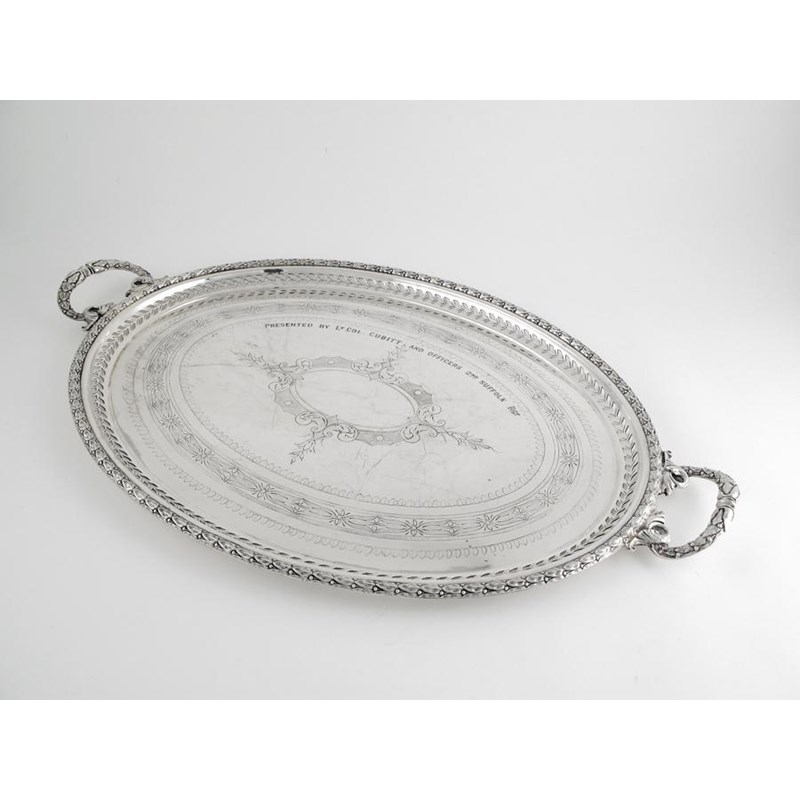 A Victorian plated oval tea tray, with engraved decoration, wreath handles and a pierced border the centre inscribed "Presented by Lt. Col CUBBITT and Officers 2nd Suffolk RGT".
