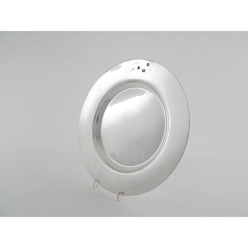 A modern plain circular dinner plate, with a broad flange, maker "CE", possibly Charles Edwards, London 1945, 10.25in (26cm) diameter, 20oz.