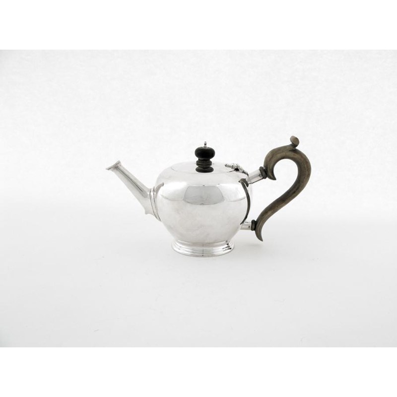 A modern bullet teapot, on a moulded foot with a scroll handle, and a hinged cover surmounted by a knop finial, by Mappin & Webb, London 1935, 16oz.