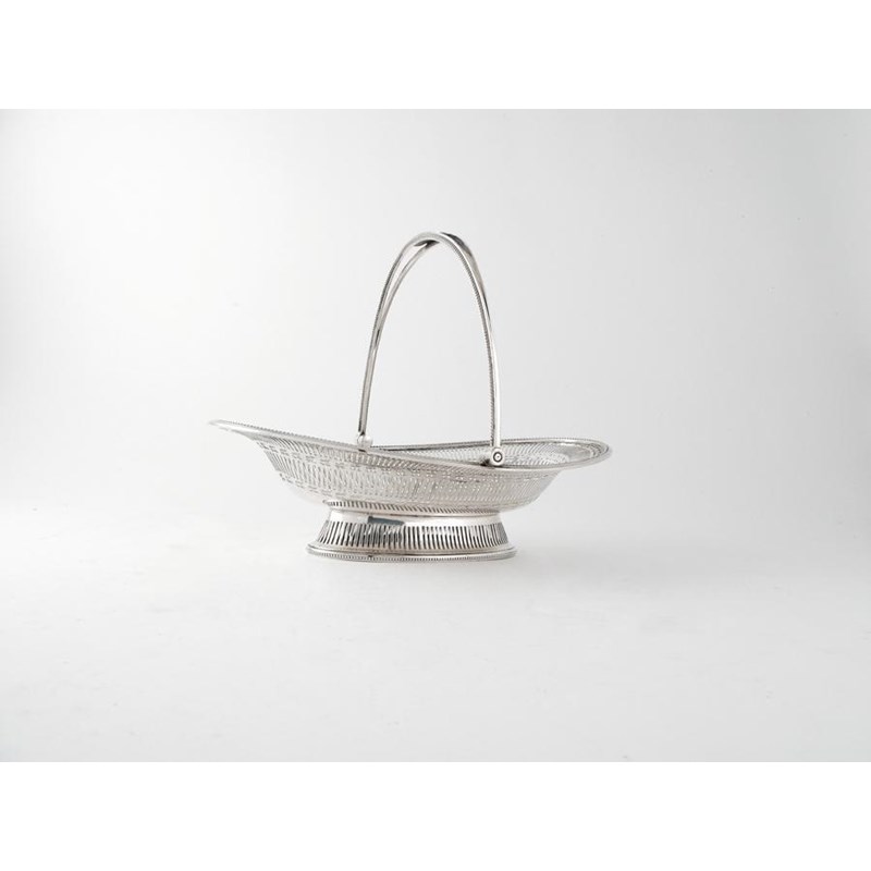 A modern, pierced oval basket, with a swing handle, bead borders and a pierced foot, by Goldsmiths & Silversmiths Co Ltd, London 1918, 12.8in (32.5cm) wide, 24oz.