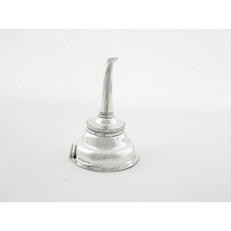 A George III wine funnel, with reeded borders, a shaped tang and a tapering spout, initialled, by Alexander Field, London 1814, 5.5in (14cm) high, 2.75oz.