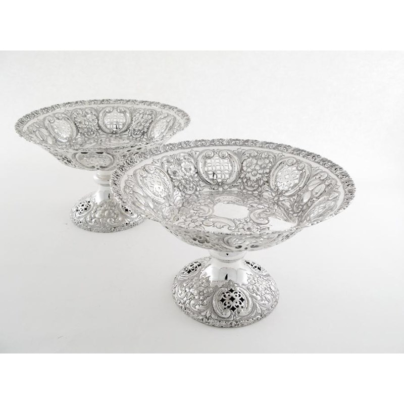 A pair of late Victorian, decorative dessert stands, with pierced and embossed decoration, by Atkin Bros, Sheffield 1899/1900, 8in (20cm) diameter, 23oz. (2)