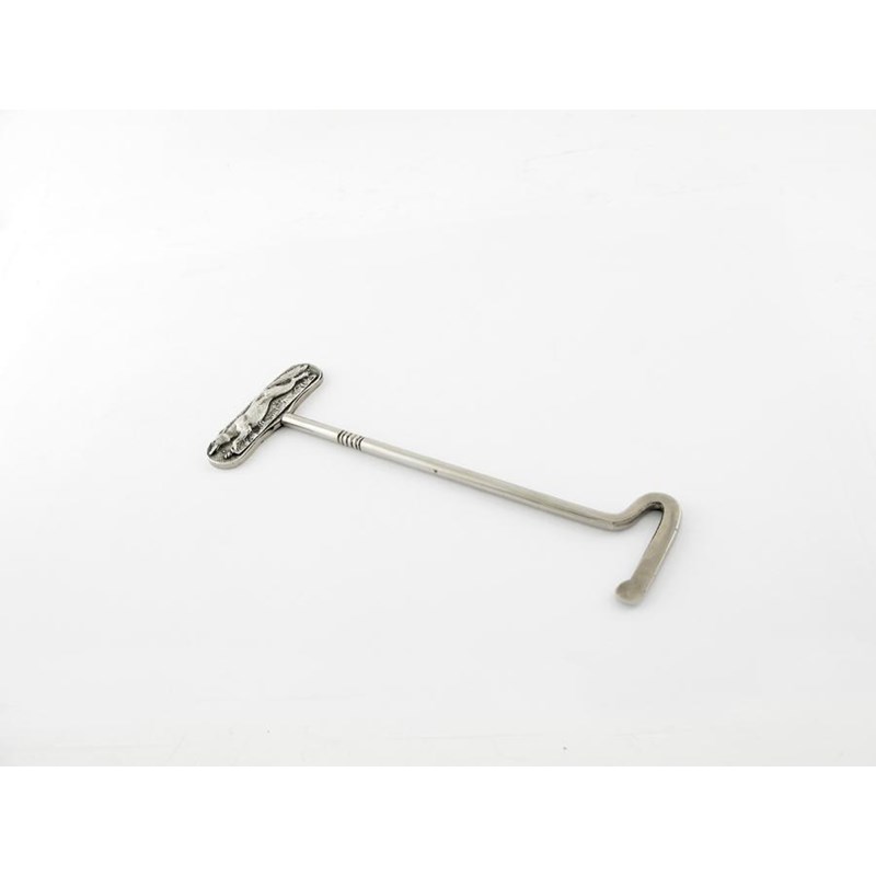 A modern mounted steel, single boot jack, decorated in relief on the handle with a running fox, inscribed "Desmond Hambleton", by G.W Lewis & Co, Birmingham 1932, 8.9in (22.6cm) long.