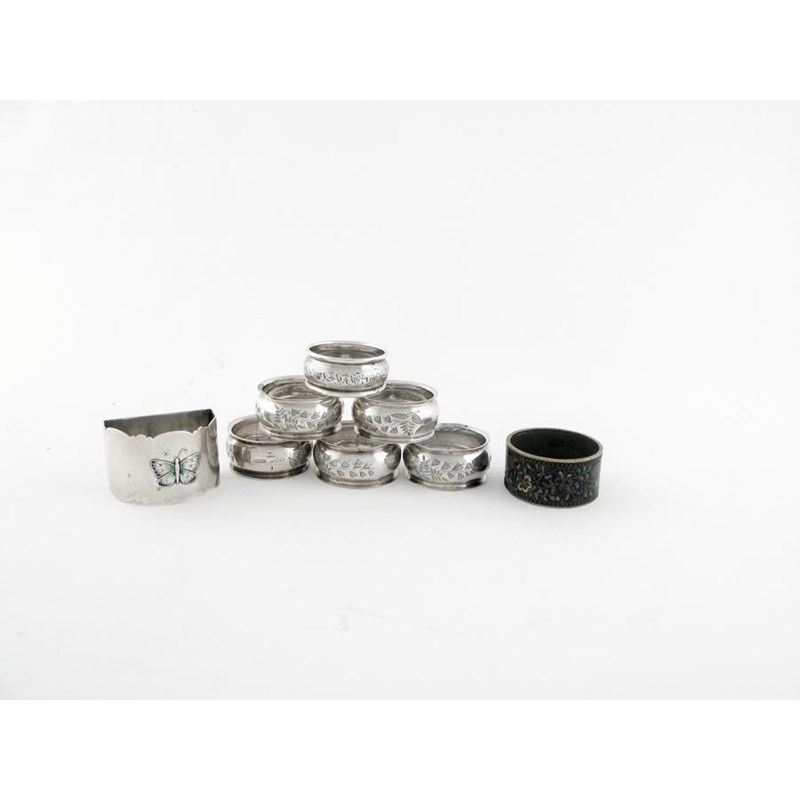 An Edwardian 'arched' napkin ring, decorated with an enamelled butterfly, by James Fenton, Birmingham 1907 together with six other engraved napkin rings, and a cloisonne enamelled brass napkin ring. (8)