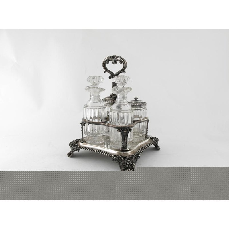A George IV square cruet frame, with large shell feet and a gadroon and foliate border, stem handle, fitted with four ribbed glass bottles (two with stoppers and two with mounts for mustard and pepper), by Robert Hennell (II) London 1829, 31.5oz weighable silver.