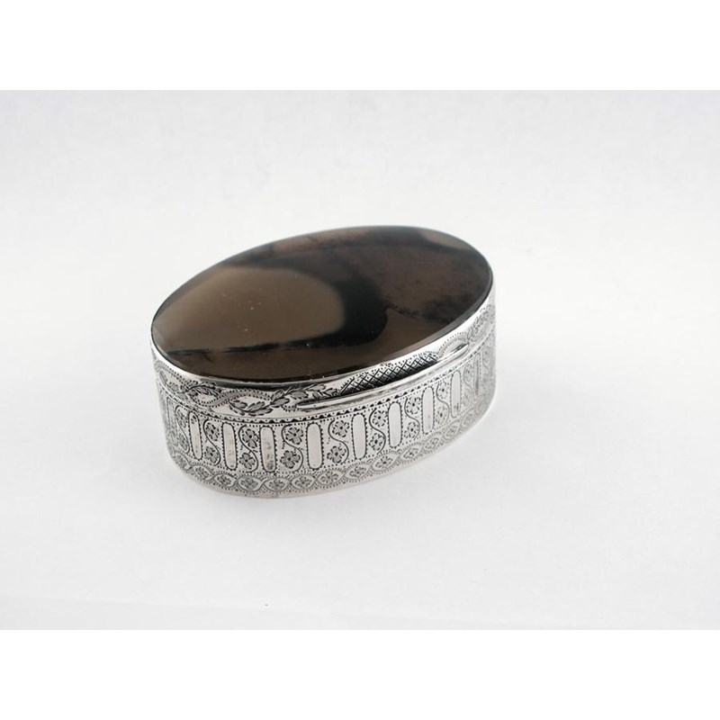 A George III engraved oval snuff box, with an agate-set cover and gilt interior, the sides decorated with ribbon-like scrolls and spaced fluting, unmarked, c.1770, 3.1in (8cm) wide.