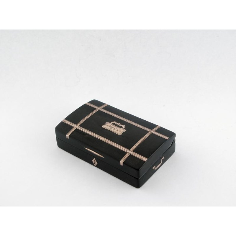A 19th century continental tortoiseshell snuff box, in the form of a valise with gold inlay to simulate handles, straps and an escutcheon, inscribed "Monica", unmarked, 3in (7.5cm) wide.