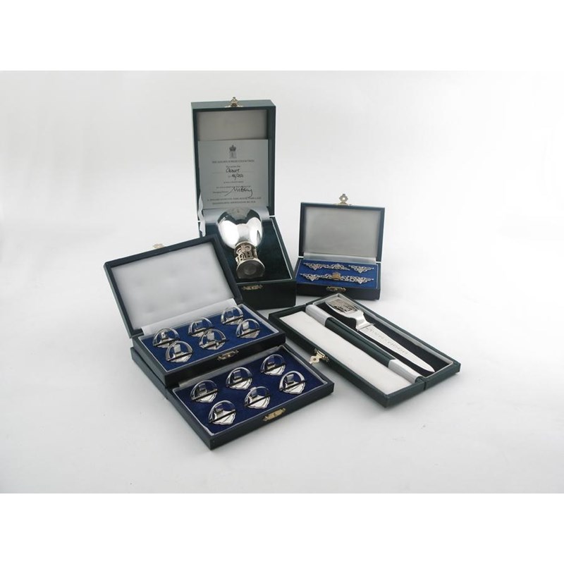 Five cased sets: a 'Golden Jubilee' commemorative goblet, a paperknife, and three sets of six place-card holders, mixed maker's and dates, 10oz weighable silver.
