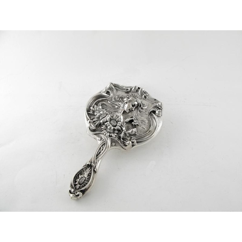 An Edwardian art nouveau hand mirror, embossed in high relief with the portrait of a maiden plucking petals from a flower, by Levi & Salaman, Birmingham 1903, 10.25in (26cm) long.