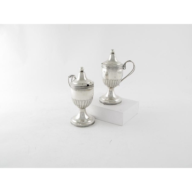 A pair of 19th century Scandinavian pedestal mustard pots, with wire handles, domed cover with ball finials and part fluting, maker's mark "BT" and three crowns only, possibly Finnish 1800-1830, 5.2in (13.2cm) high, 6oz. (2)