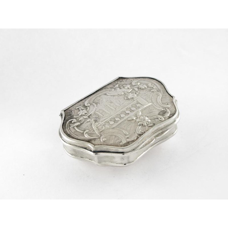 A George III 'cartouche' snuff box, the cover inset with a chased panel with a bird and a vase of flowers on a balustrade within a scroll border, the base initialled, gilt interior, probably by James Perry, London 1776, 2.75in (7cm) wide, 2oz.