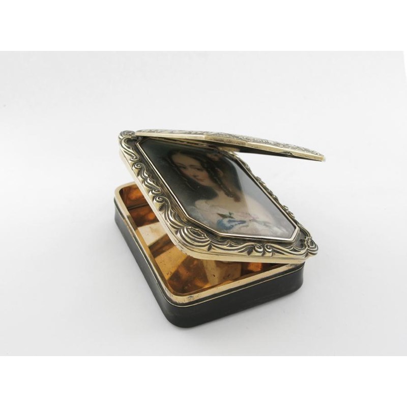A William IV/early Victorian large, silvergilt mounted tortoiseshell snuff box, rounded oblong form with a scroll border around the cover, crested by a canted oblong panel profusely engraved with birds, floral scrolls and trellis work and flowers, the panel hinging up to reveal the miniature portrait of a beautiful young girl (behind glass) with her hair in ringlets by A E Chalon, (apparently unsigned), the box unmarked, 1835-40, 3.85in (9.8cm) long.
