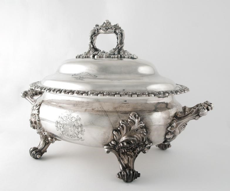 A George IV Scottish soup tureen and cover, of squat oval form on four ornate foliate scroll feet, with two handles and a border of repeating foliate motifs, the cover domed and surmounted by a large handle decorated in relief with acorns and oak foliage, the body engraved on each side with a coat of arms,* the cover with the crest and motto "KIND HEART BE TRUE AND YOU SHALL NEVER RUE", on each side, maker's mark of "MACKAY", Edinburgh 1825, 17in (47.7cm) wide, 134oz. * Arms of........................
