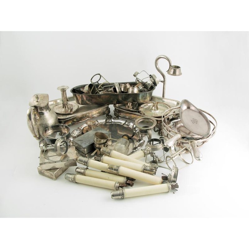A mixed lot of plated ware: an adjustable wine bottle holder, a snuffer stand, a knife tray, two warming bases, two dish holders, a hotwater jug, three sandwich boxes, etc. (lot)
