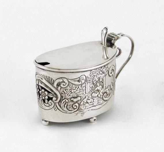 An Edwardian small oval mustard pot, with a stamped pastoral scene on one side and pierced scrolls, on the other, by Levi & Salaman, Birmingham 1902, 1.5oz weighable silver.