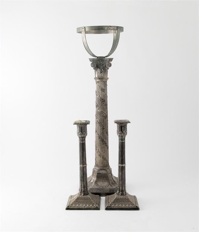 A Victorian, large plated lamp base, in the form of a column with floral garlands, together with a pair of Victorian plated cluster column candlesticks, the former 22.5in (57.5cm) high. (3)