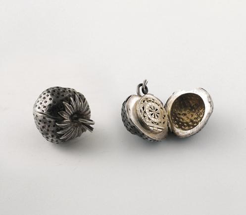 A rare Victorian naturalistic vinaigrette in the form of a strawberry, hinging open to reveal a circular grille, incised "S. MORDAN & Co LONDON" , by S. Mordan & Co, c.1870, 1.4in (3.4cm) high.