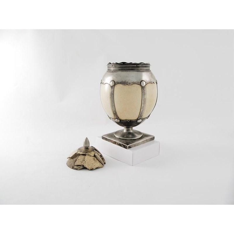 An early 19th century Maltese mounted ostrich egg cup and cover, on a square pedestal foot, A/F maker's mark "TS", c.1800, 7in (18cm) high.