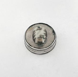 A George III memento-mori patch box and cover, set with a funerary emblems behind painted glass unmarked, c.1800, 1.1in (2.7cm) diameter.