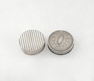 Two George III small circular patch boxes and covers: one with a fluted cover by Joseph Taylor, Birmingham 1800; the other bright-engraved by Samuel Pemberton, Birmingham 1791. (2)
