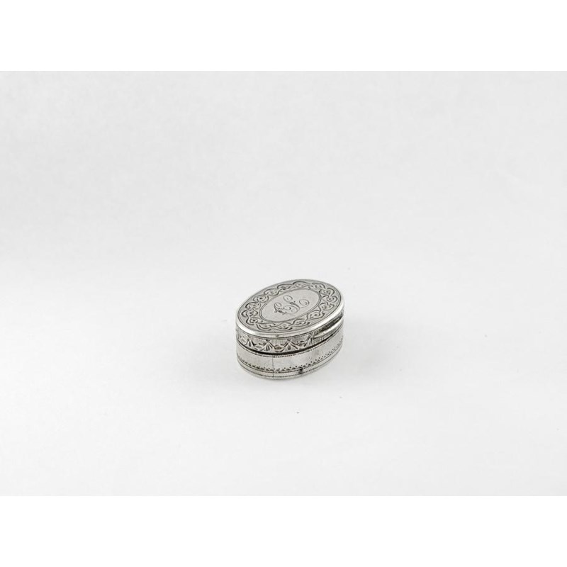 A George III engraved oval vinaigrette, initialled "C.L" on the cover, the grille using the same hinge lugs as the cover, by Robert Nash, London 1800, 1.1in (2.7cm) long.